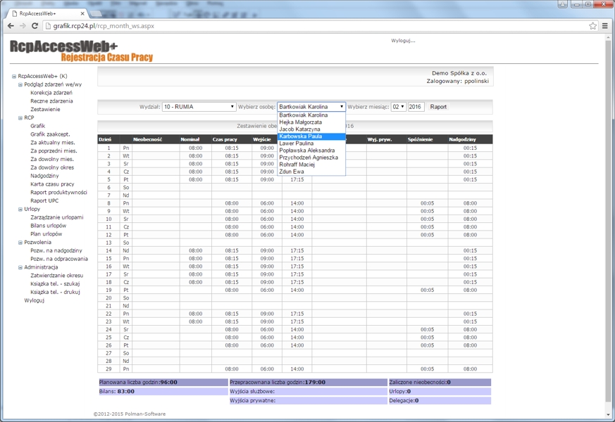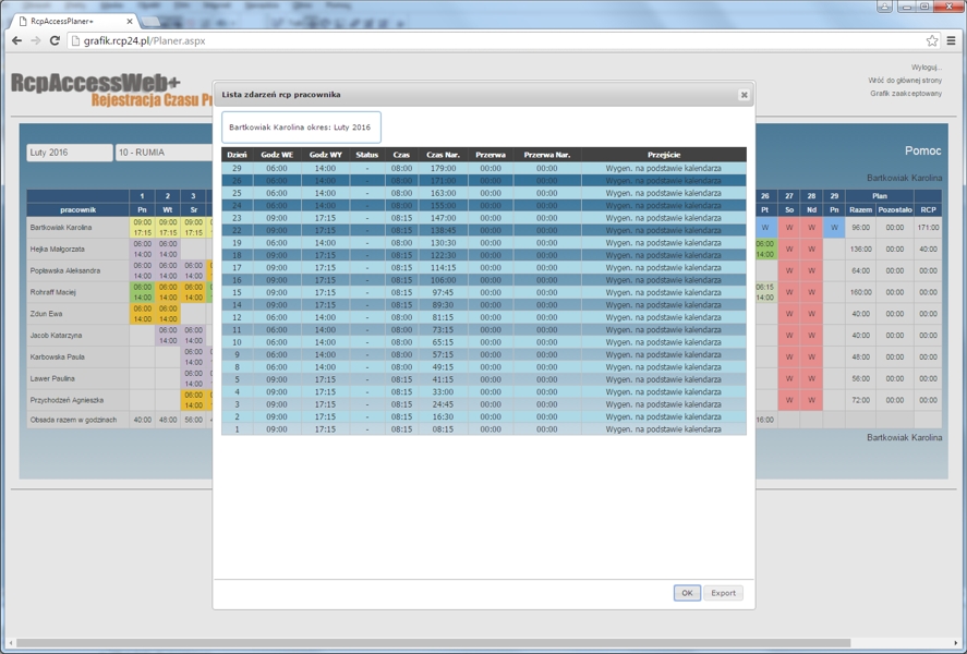System Rejestracji Czasu Pracy Online, RcpAccessWeb+, umożliwia rozliczanie i prezentację czasu pracy, nadgodzin, urlopów i innych danych,